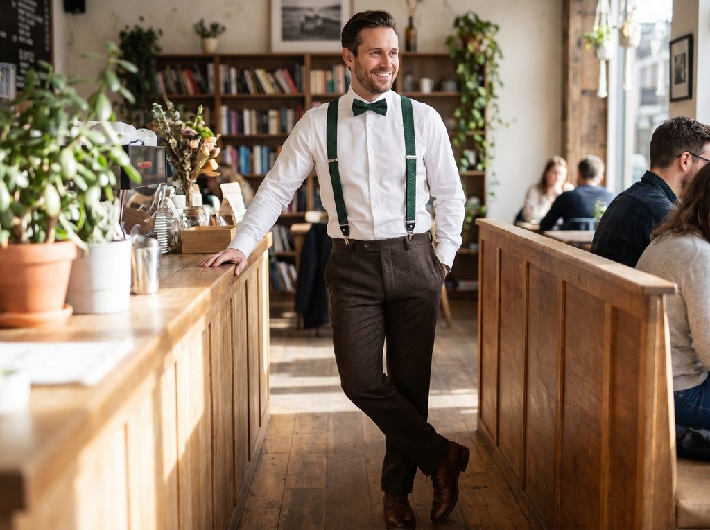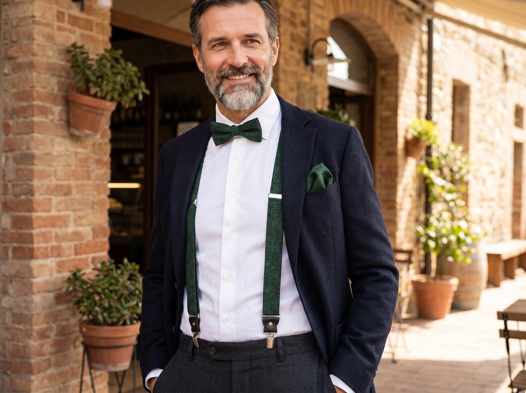 A zöld nadrágtartó akkor érvényesül a legjobban, ha egyszerű, világos inggel párosítja, amely kiemeli a színét. A díszzsebkendőt viselheti letisztult, egyenes hajtással vagy lazább formában. Esküvőn jól mutat sötétebb nadrággal és bőrből készült kiegészítőkkel, amelyek egységessé teszik az összképet.