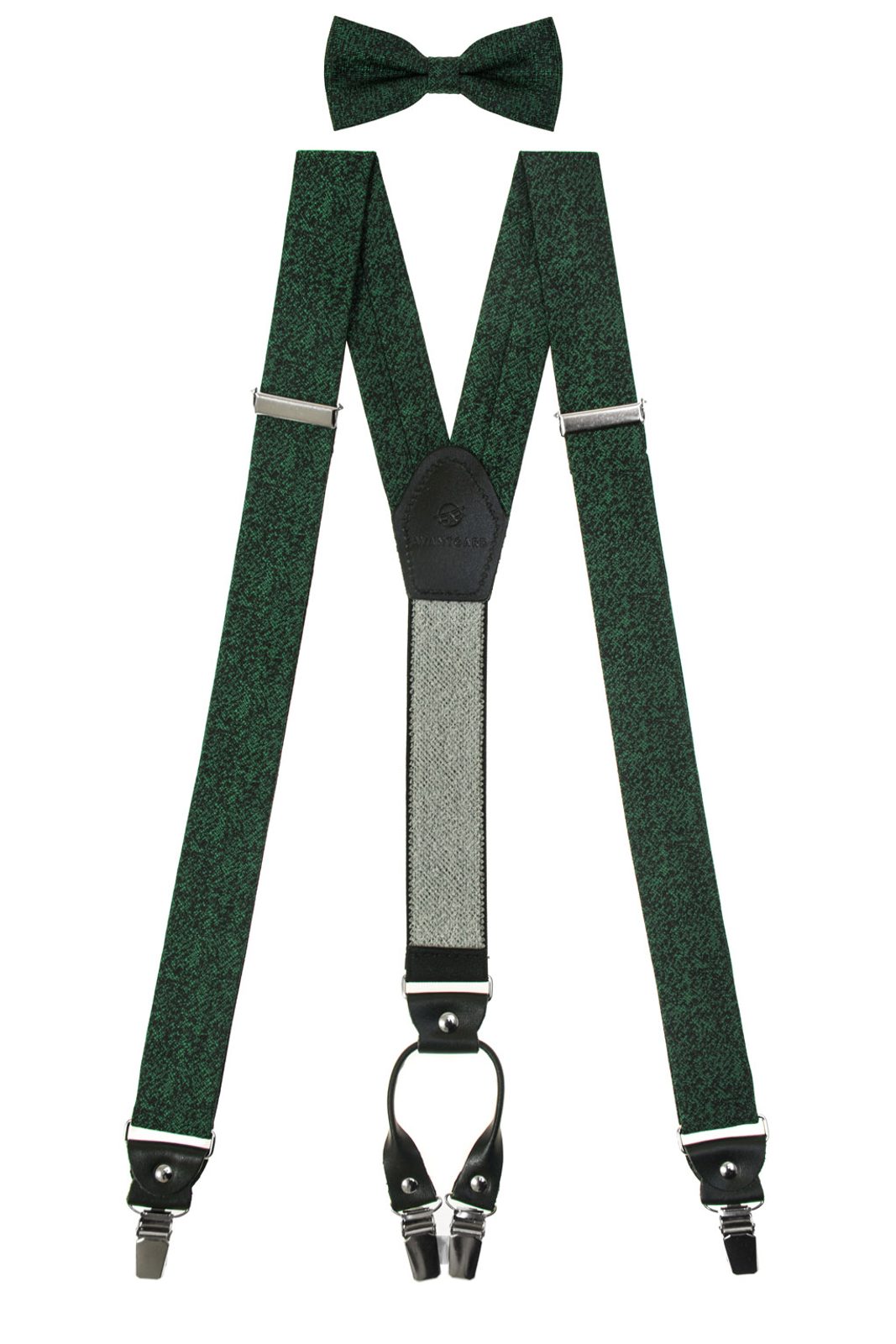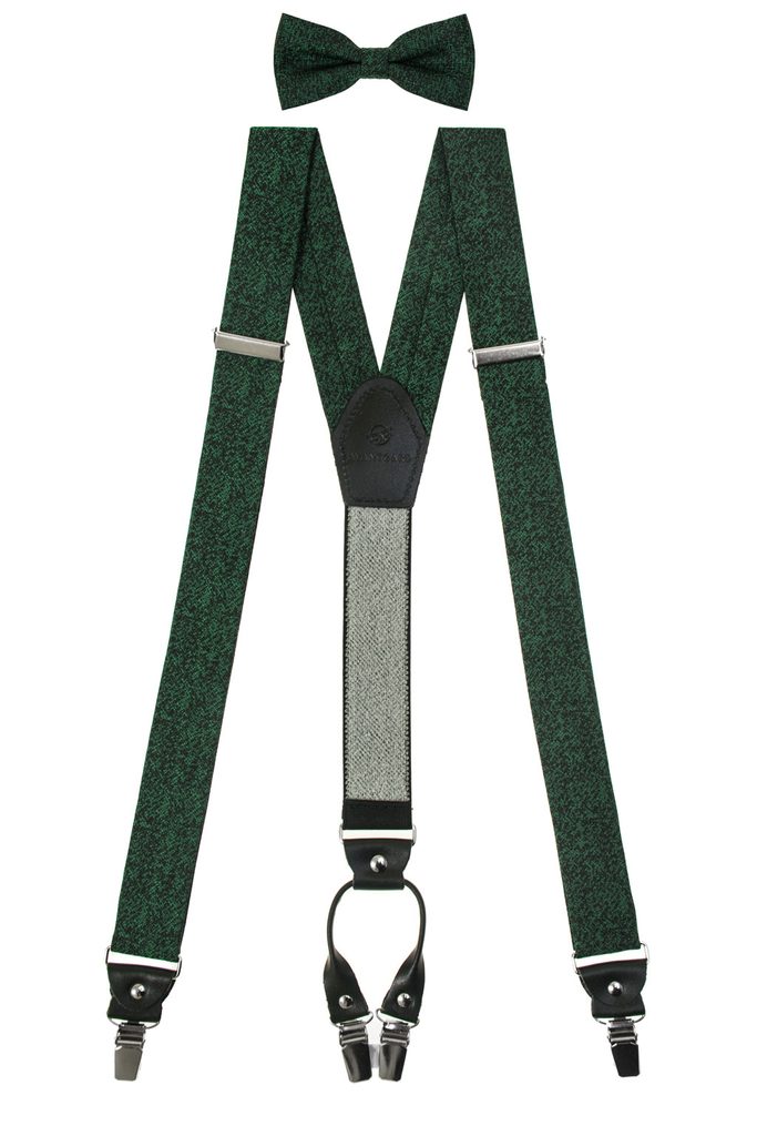 A csokornyakkendő előre kötött, így mindig megtartja formáját. Az állítható rögzítés kényelmes viseletet biztosít. A nadrágtartó szélesebb pántokkal készült a jobb tartás érdekében, erős kapcsokkal és bőrből készült részletekkel, amelyek egységes megjelenést adnak a szettnek.