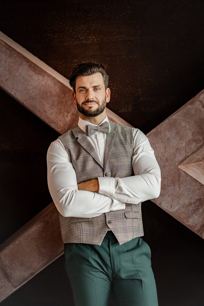 Ez a mintás, elegáns pánmellény motyóllyal ideális választás olyan férfiak számára, akik klasszikus, mégis modern megjelenést szeretnének. A meleg, természetes színekben és finom kockás mintázattal készült design eleganciát sugároz anélkül, hogy túl feltűnő lenne — tökéletes vőlegényeknek, tanúknak és vendégeknek.