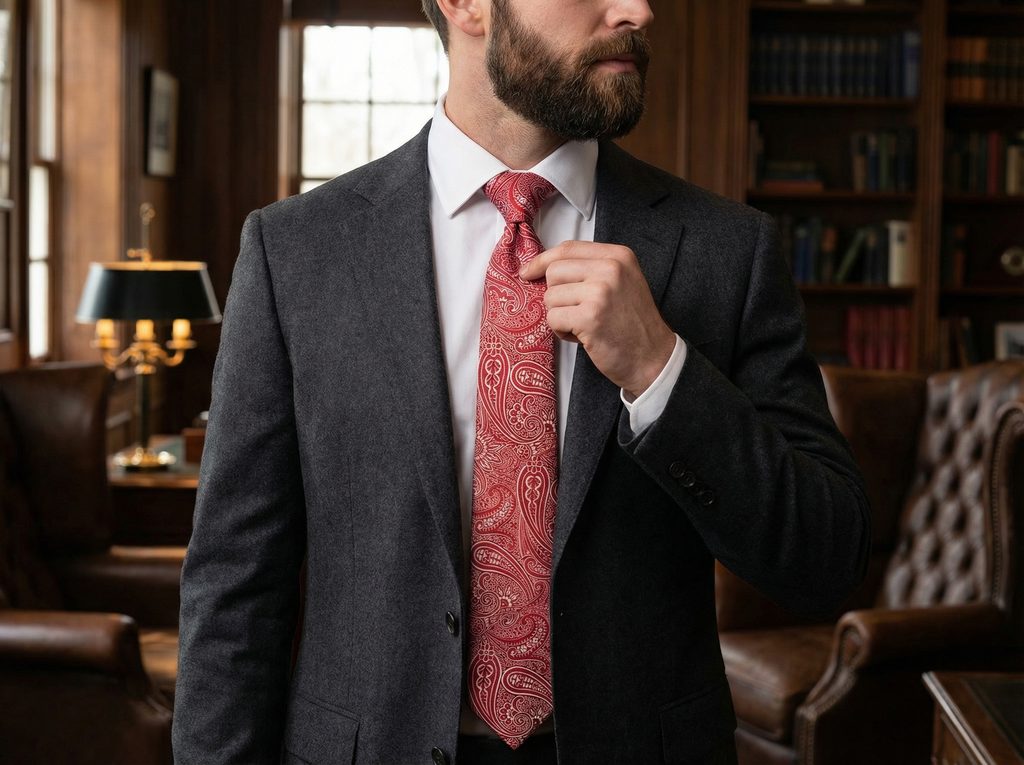 Az eredeti, piros kasmír mintás férfi nyakkendőt fehér kontúrok egészítik ki. Ez a fantáziadús, körülbelül 8 cm széles nyakkendő a ruhatárad dísze lesz.