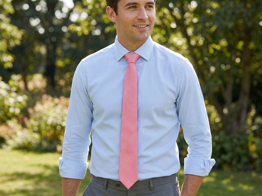 Nem minden nyakkendőnek kell erőteljesnek lennie ahhoz, hogy hatást keltsen. Ez a rózsaszín darab finoman emeli ki az öltözéket, és könnyedséget visz az összhatásba.