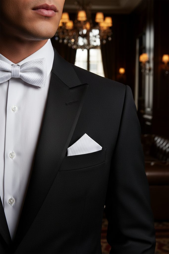 Előre megkötött Fehér csokornyakkendő díszzsebkendővel, fényes csíkokkal 12,5 cm tökéletesen passzol minden frakkhoz vagy szmokinghoz. A csokornyakkendő hátulján egy fűzőlyukkal ellátott kampó van rögzítve, melynek köszönhetően a hossza könnyen állítható a nyak kerületének megfelelően.