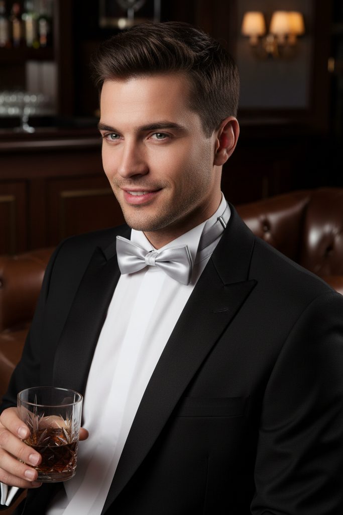Előre megkötött Fénylő ezüstszínű férfi csokornyakkendő 12,5 cm tökéletesen passzol minden frakkhoz vagy szmokinghoz. A csokornyakkendő hátulján egy fűzőlyukkal ellátott kampó van rögzítve, melynek köszönhetően a hossza könnyen állítható a nyak kerületének megfelelően.