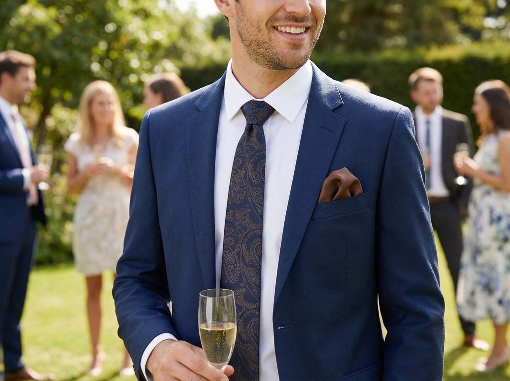 Sötétkék vagy szürke öltönnyel és világos inggel működik a legjobban, így a nyakkendő szépen kiemelkedik, mégsem válik túl hangsúlyossá. Egy visszafogott díszzsebkendő hasonló árnyalatban vagy barna nadrágtartó jól kiegészíti – ideális választás esküvőre, esti rendezvényre vagy bármilyen alkalomra, amikor rendezett, mégis természetes megjelenést szeretne.