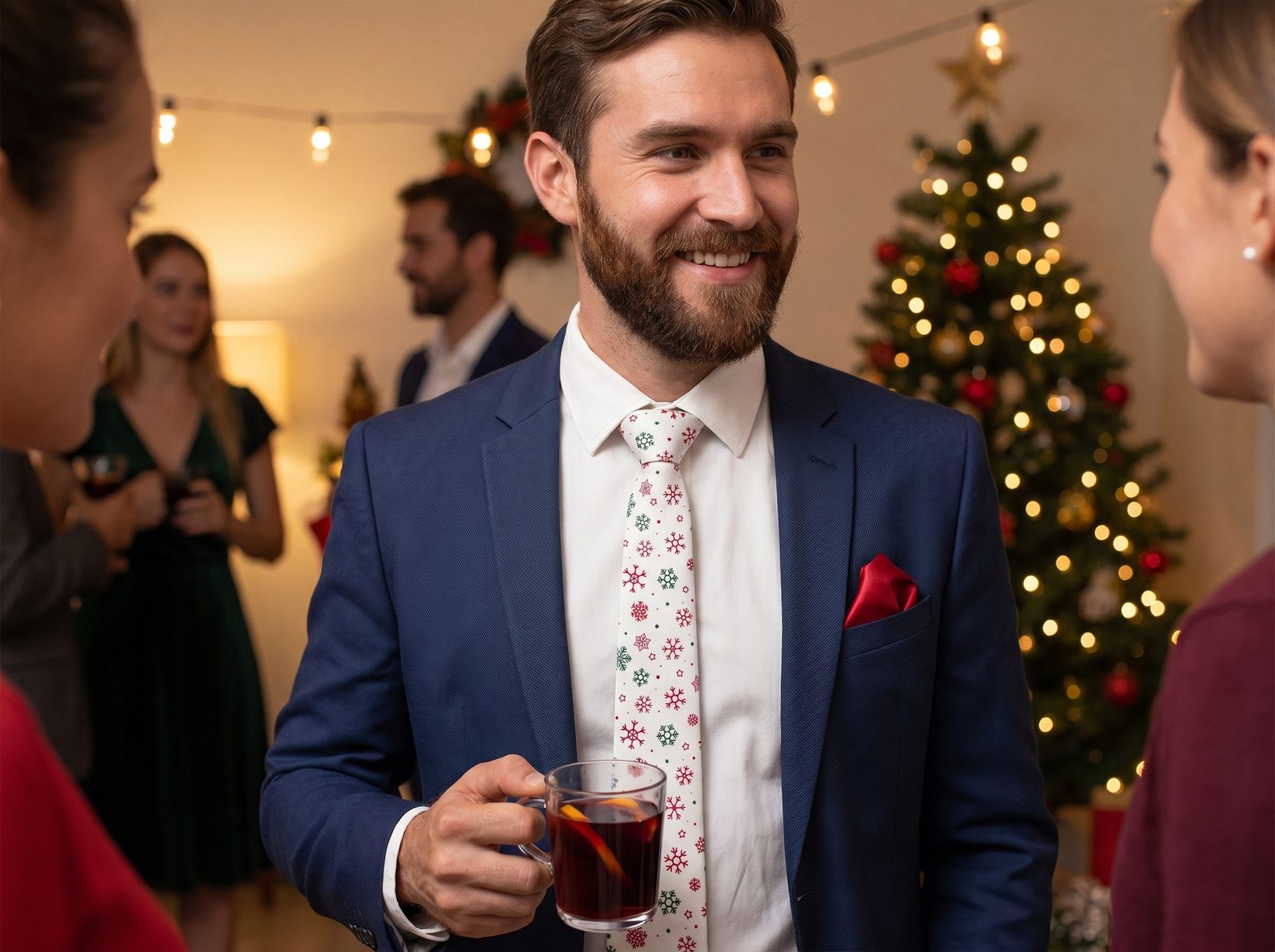 A karácsonyi motívumok nem feltétlenül feltűnőek. A jól megválasztott darabok inkább finom részletként jelennek meg, amelyek természetesen illeszkednek az öltözékhez. Egy bordó nyakkendő apró mintával vagy egy sötétzöld csokornyakkendő már önmagában elegendő ahhoz, hogy az outfit kilépjen a hétköznapokból.